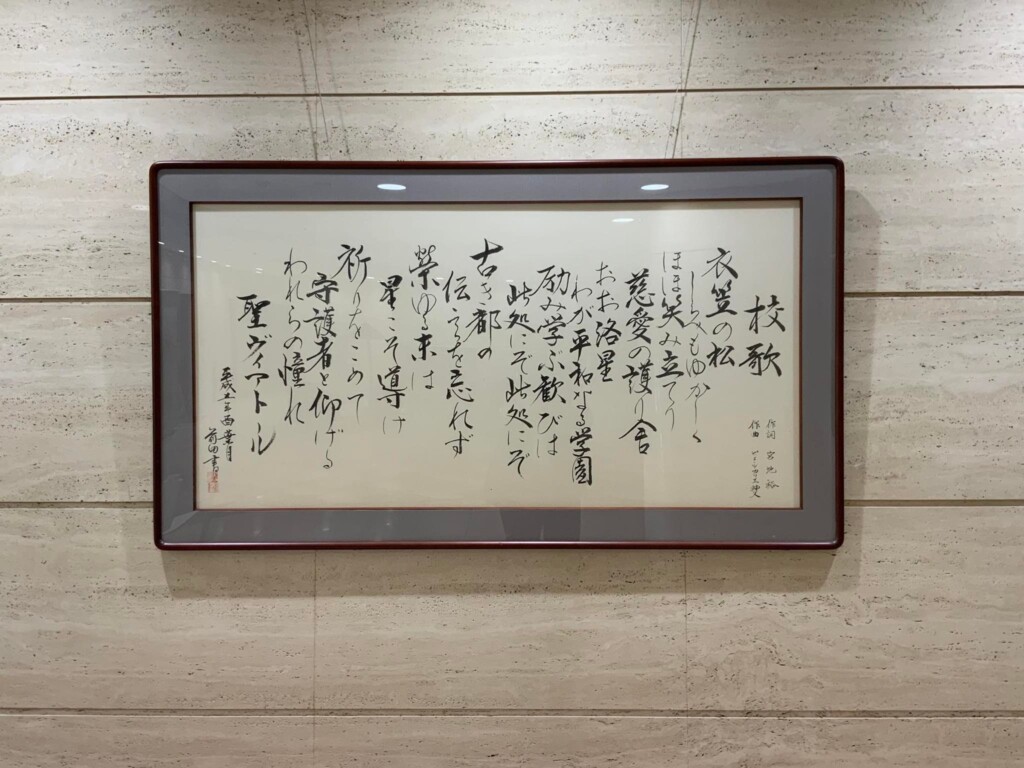 校歌額は、永らく同窓会室に掲げてありましたが、同窓生だけでなく、学園にお越しになるもっと多くのみなさまに見ていただきたいとの思いで、学園に寄贈を申し出たところ快くお受けいただき、今回の掲額となった次第です。