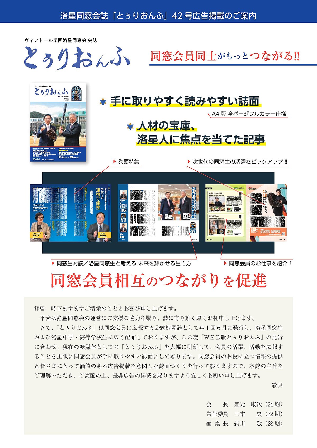 事務局だより 「とぅりおんふ」42号 広告掲載のご案内 掲載をご検討いただける同窓生の方は、 1.以下の広告掲載資料jpg 2. またはリンク先のPDF をご覧ください。 事務局 事務局だより 訃 報 リンク集 プライバシーポリシーに関して サイトポリシーに関して アクセス お問い合わせ