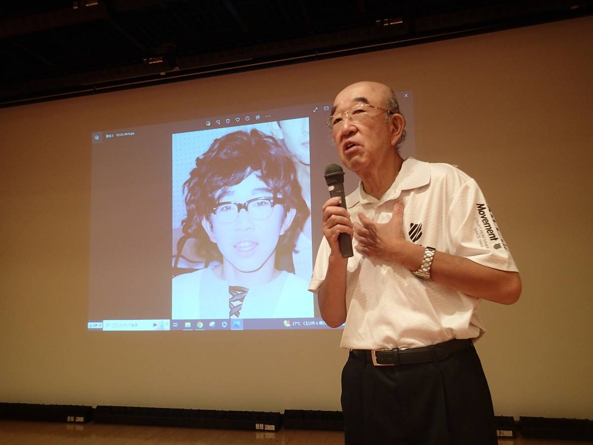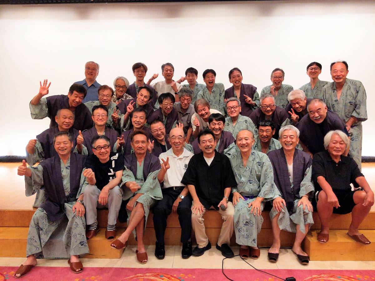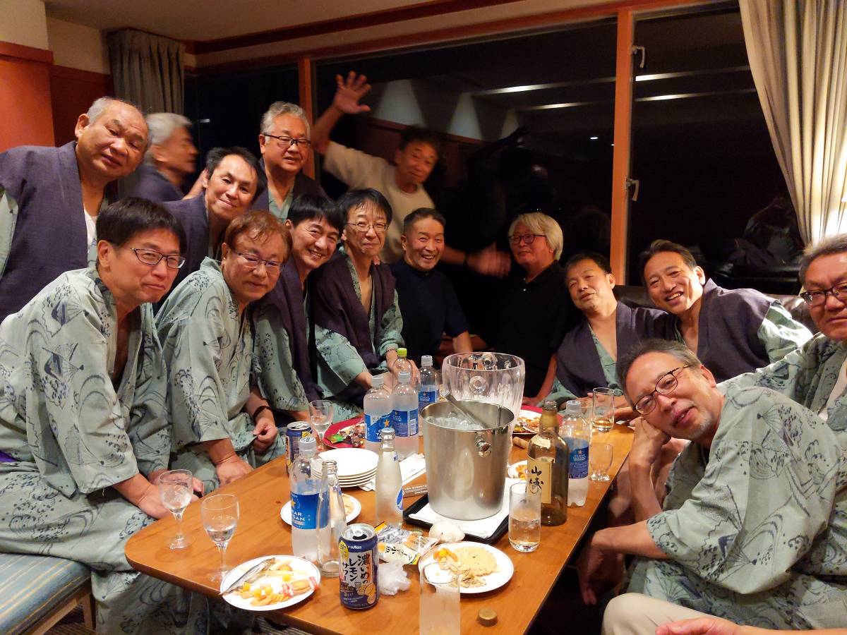 初日は、焼津随一のホテルアンビア松風閣にて宴会前、これまでに帰天した12名の友人の若き日の写真を投影して偲びました。宴会では会席料理に、静岡の銘酒「磯自慢大吟醸」に舌鼓をうちながら、参加者1人ずつの壇上1分間スピーチを聞くという趣向でした。昔の写真をバックに投影する順番に壇上に上がりスピーチをするのですが、当然「あれ誰や?」という声が出る中、名司会泉さんの進行と、本人のおもろいスピーチで大盛り上がりでした。