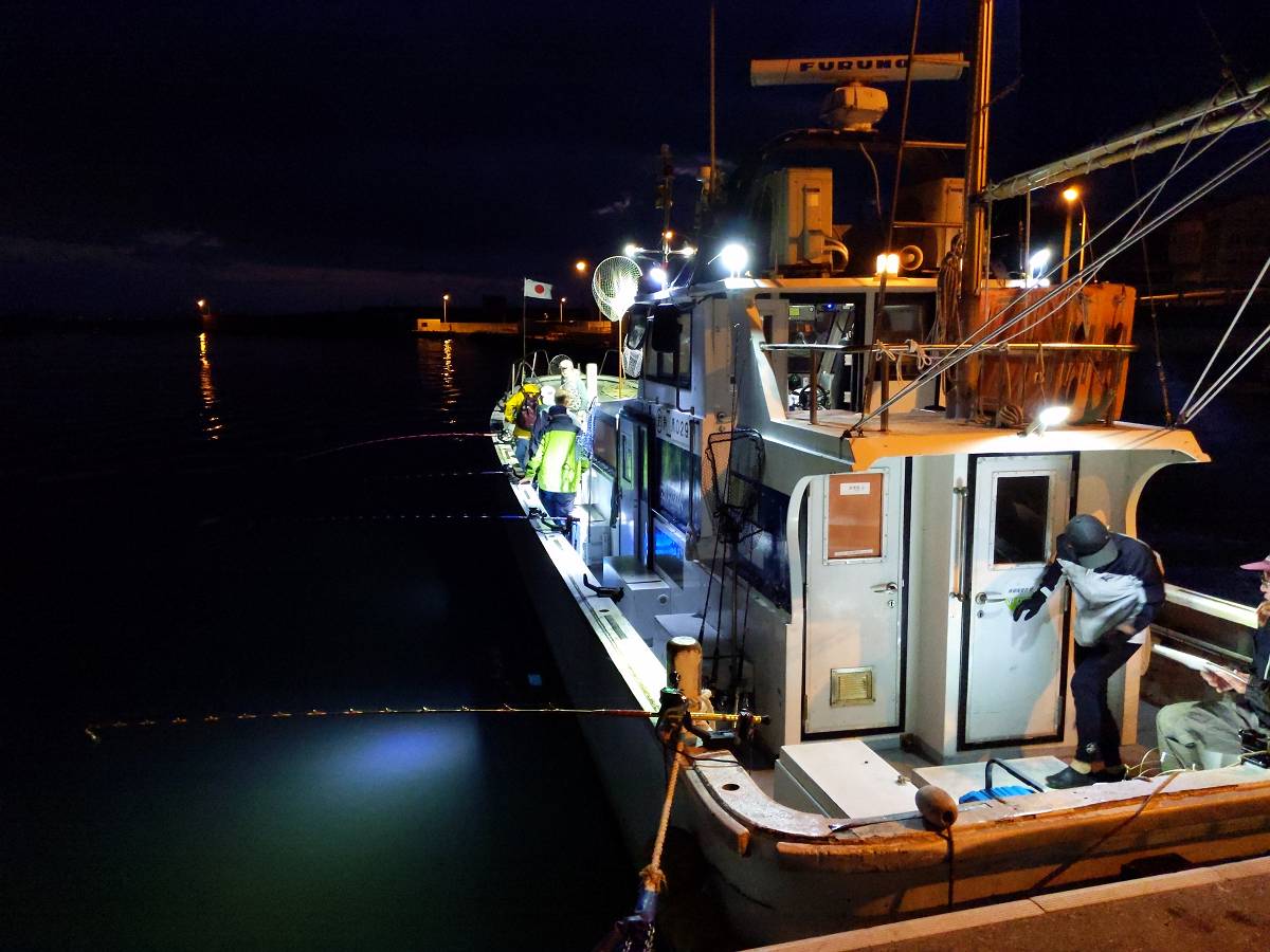 焼津港から朝5:30に貸切漁船は駿河湾の釣りポイントに向けて出港。6時から12時まで、参加者8名は水深130mの獲物と勝負です。電動リールや釣り竿など一式を人数分用意してくれましたので参加者は手ぶらで楽させていただきました。